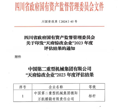 近日,四川省國資委發(fā)布“天府綜改企業(yè)”2023年度評估結(jié)果,繼2022年獲評“優(yōu)秀”等級后,萬航模鍛在2023年度全省100戶“天府綜改企業(yè)”中成功獲評A級(標(biāo)桿)等級。